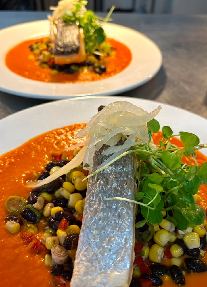 Butter Roasted Salmon, Roasted Sweetcorn & Black Bean Salsa, Smoked Paprika And Red Pepper Cream Sauce. 🍽️🌽🐟🍻